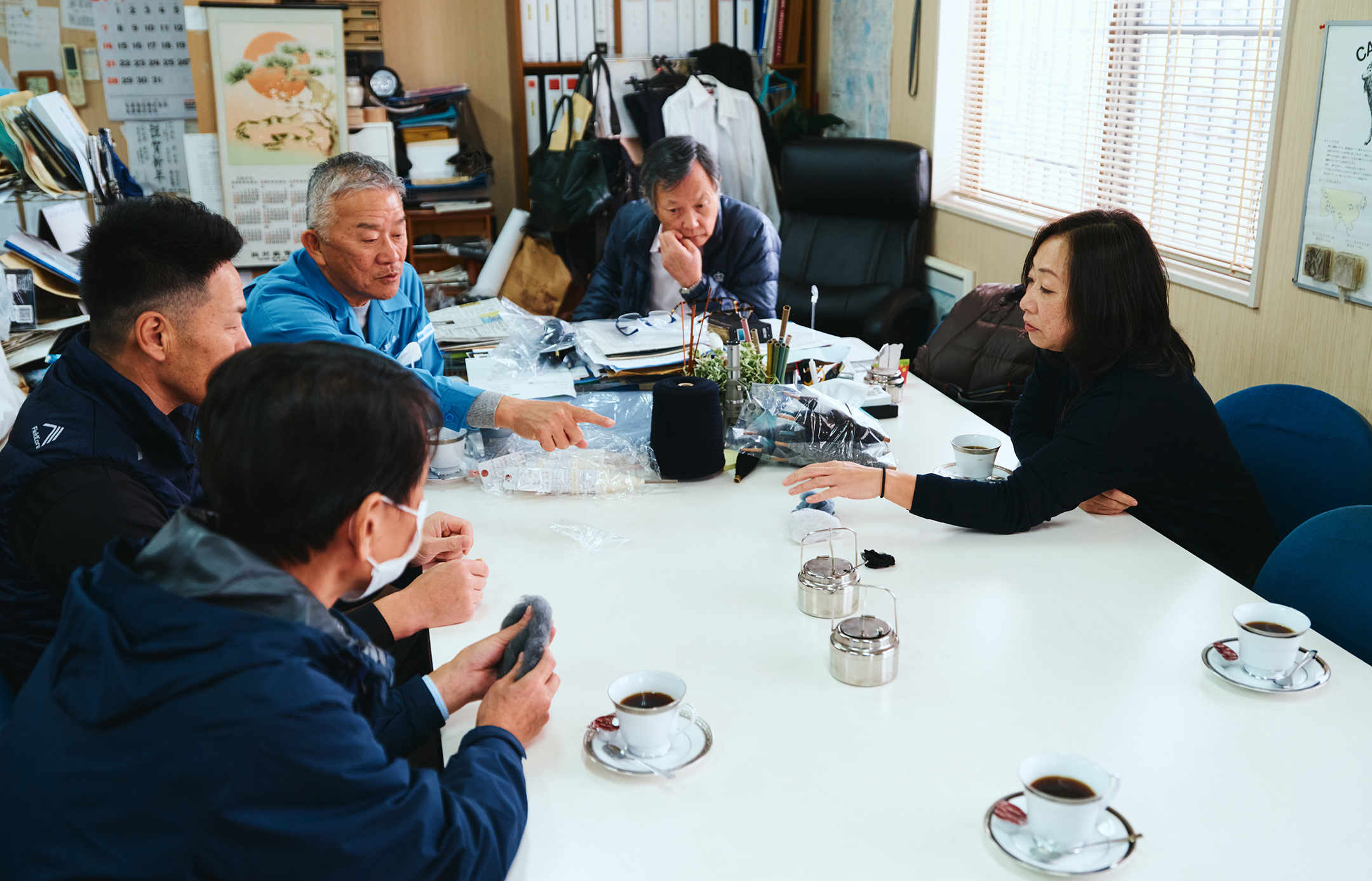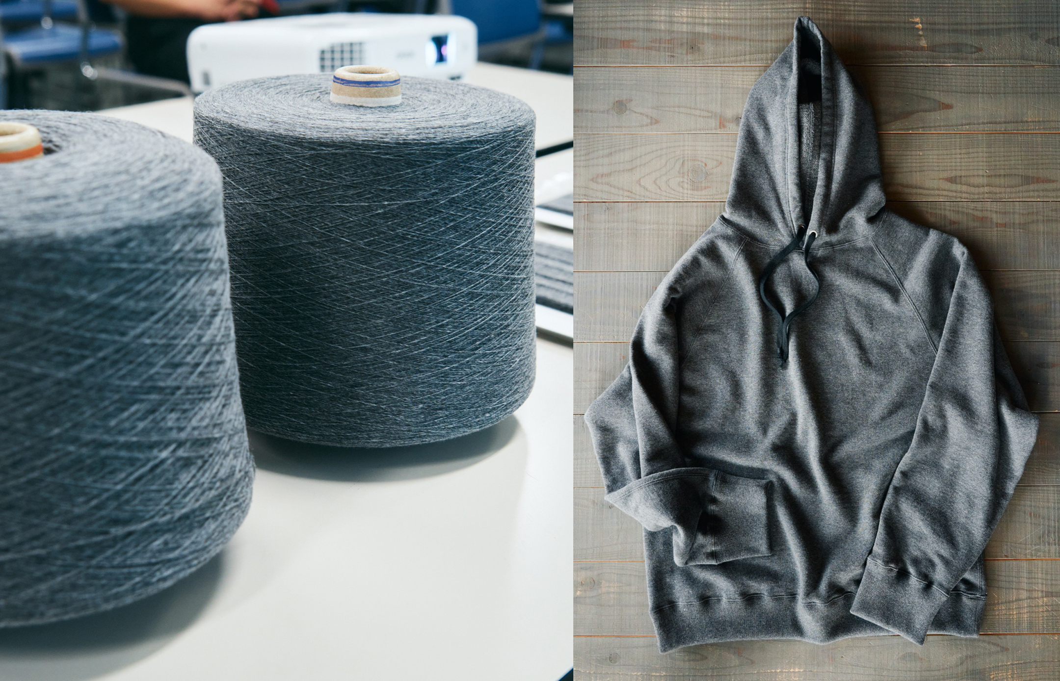 「ぐるぐるふくいで僕が面白いなと感じているのは、繊維大国・福井で出たポリエステルやナイロンの端材を一回溶かしてペレットにして、それを大阪でウールとポリエステルの綿を混合したマテリアルリサイクル糸にして、その糸を使って和歌山でニットの生地を作って、それを福井の縫製工場に戻してニット製品にして……と、福井だけで全てを完結させるのではなく、周辺の技術を持つ地域を巻き込みながら、共創で実現していく仕組みになっているところです。福井を一回出て、また帰ってくることも含めての “ぐるぐる”になっているんです」